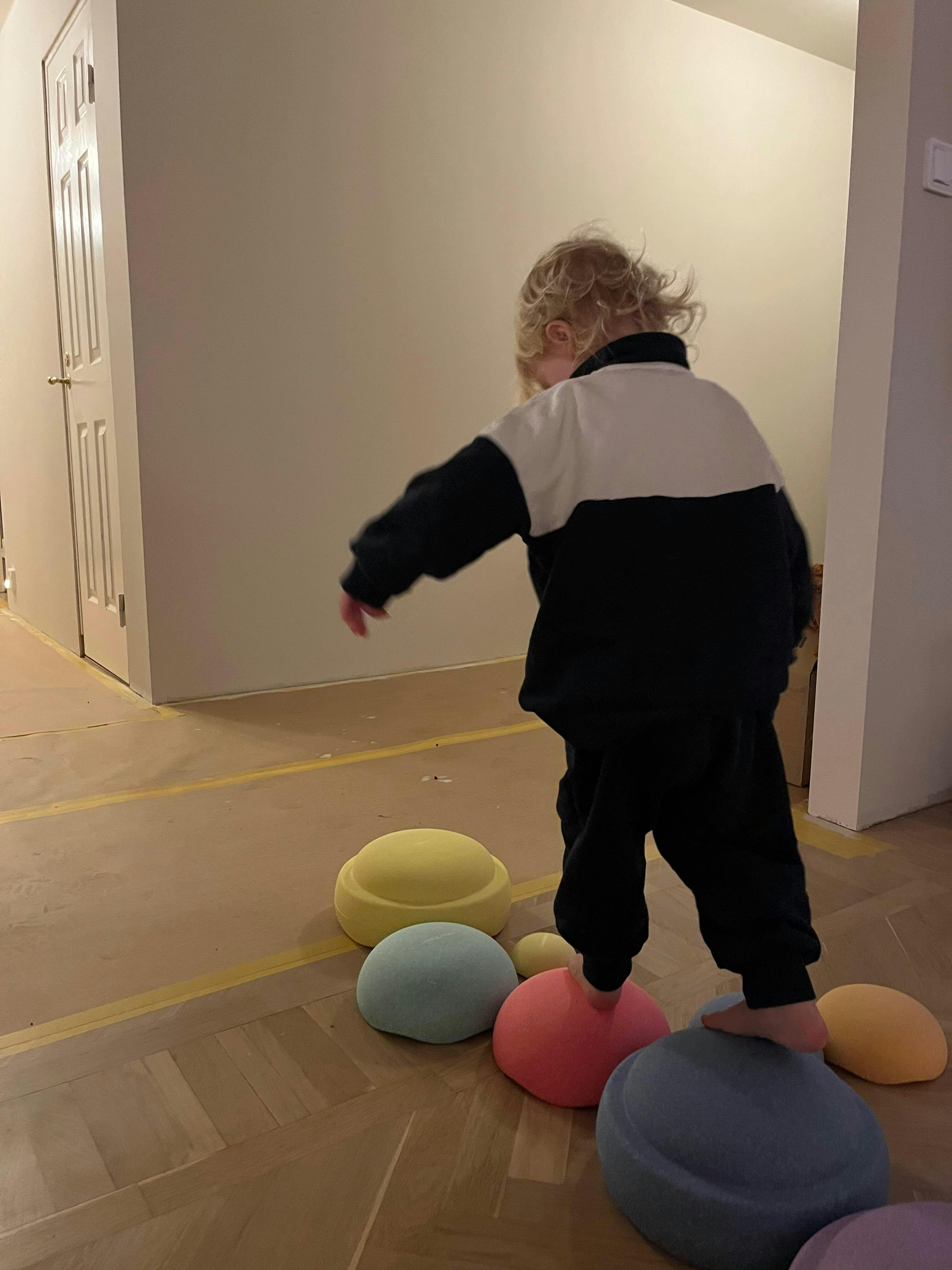 Verwende eine ebene, rutschfeste Oberfläche, wenn mit Stapelstein® Produkten balanciert oder Hindernisparcours gebaut werden.